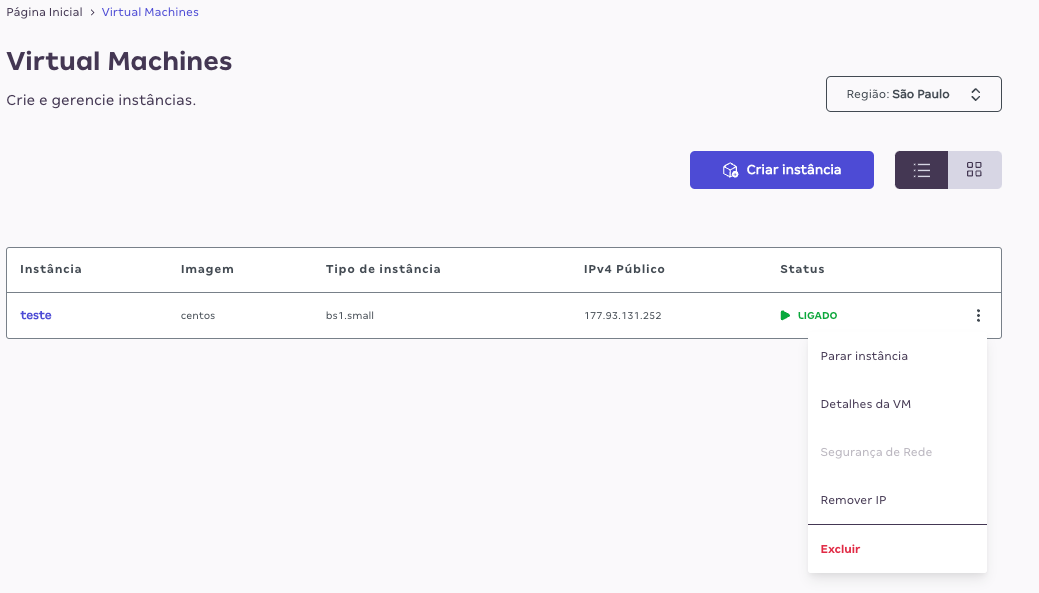 Há duas maneiras de associar um IP Público a uma instância. A primeira é via listagem das instâncias no menu de cada recurso.