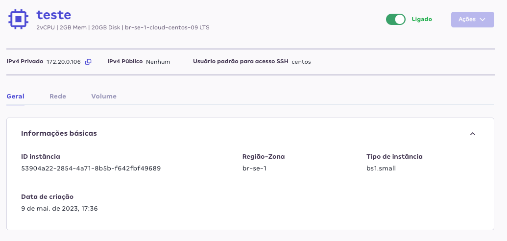 Na aba Geral, você terá acesso a informações básicas da instância, como: