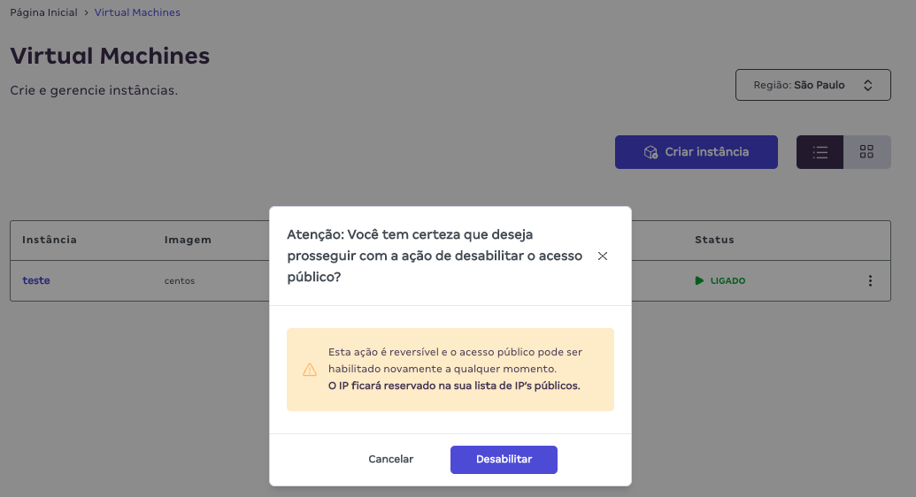Assim como a atribuição de IPs, a desassociação dos IPs também pode ser feita das duas maneiras, na listagem das instâncias ou na página de detalhes da VM na aba de Redes.