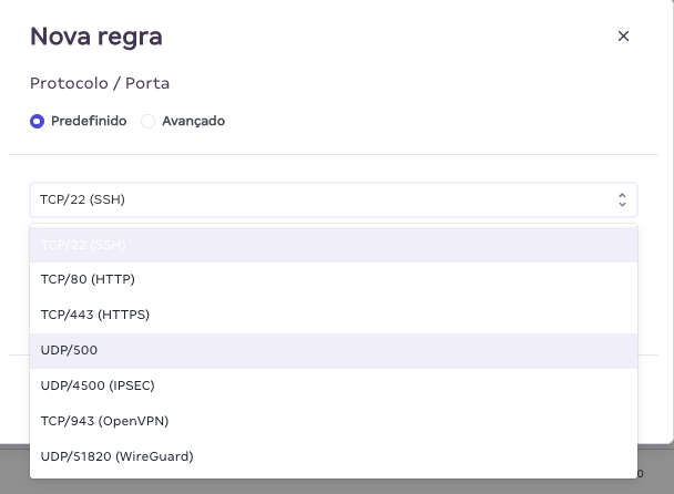 - Se Avançado, para definir uma porta que não consta em configurações predefinidas, é necessário abrir um ticket.