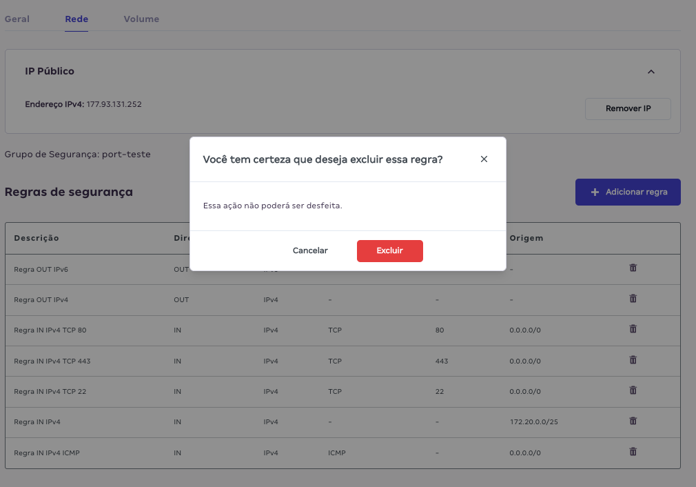 - Confirmar a exclusão da regra em específico. Lembrando que essa ação não pode ser desfeita.