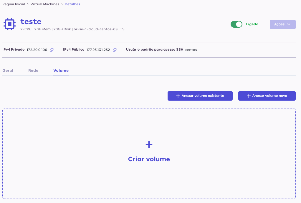 Há várias maneiras de realizar essa ação via a página do próprio Block Storage, mas também é possível realizar via página de detalhes da instância. Nesse tutorial, abordaremos apenas o caminho via páginas de Detalhes da VM.