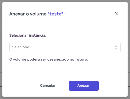 - Selecione o volume já existente que deseja anexar e clique em “Anexar volume”.