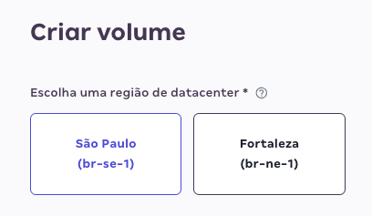 - Escolha a região que deseja criar o seu volume. Por criar um volume, via uma instância em específico a seleção da região já vem com a mesma região da instância em questão. Caso seja sua vontade criar em outra região, você poderá mudar a seleção de regiões, mas lembre-se que não poderá anexar a uma instância de região diferente de onde o volume foi provisionado.