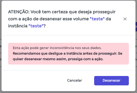 - Confirme a ação clicando em “Desanexar”. Recomendamos que desligue a instância antes de prosseguir para não haver inconsistências com sua máquina virtual e o seu volume.
