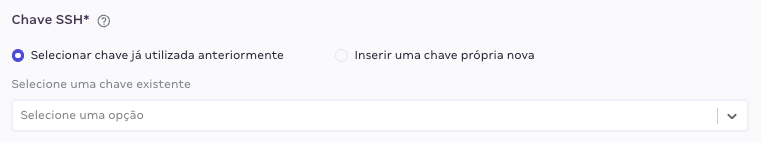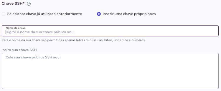 Ou, insira e salve uma nova chave pública SSH. Para isso defina um nome para essa nova chave e depois cole a sua chave pública SSH no campo abaixo.