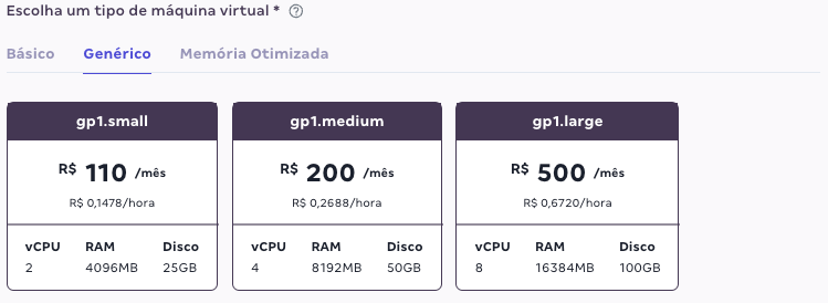 - Selecione o tipo de máquina virtual de acordo com as opções de configuração da máquina virtual que deseja;