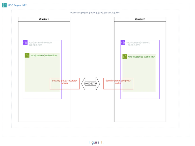 A configuração de rede atual possibilita que os Clusters se comuniquem através do range de portas 30000-32767 conforme diagrama abaixo.